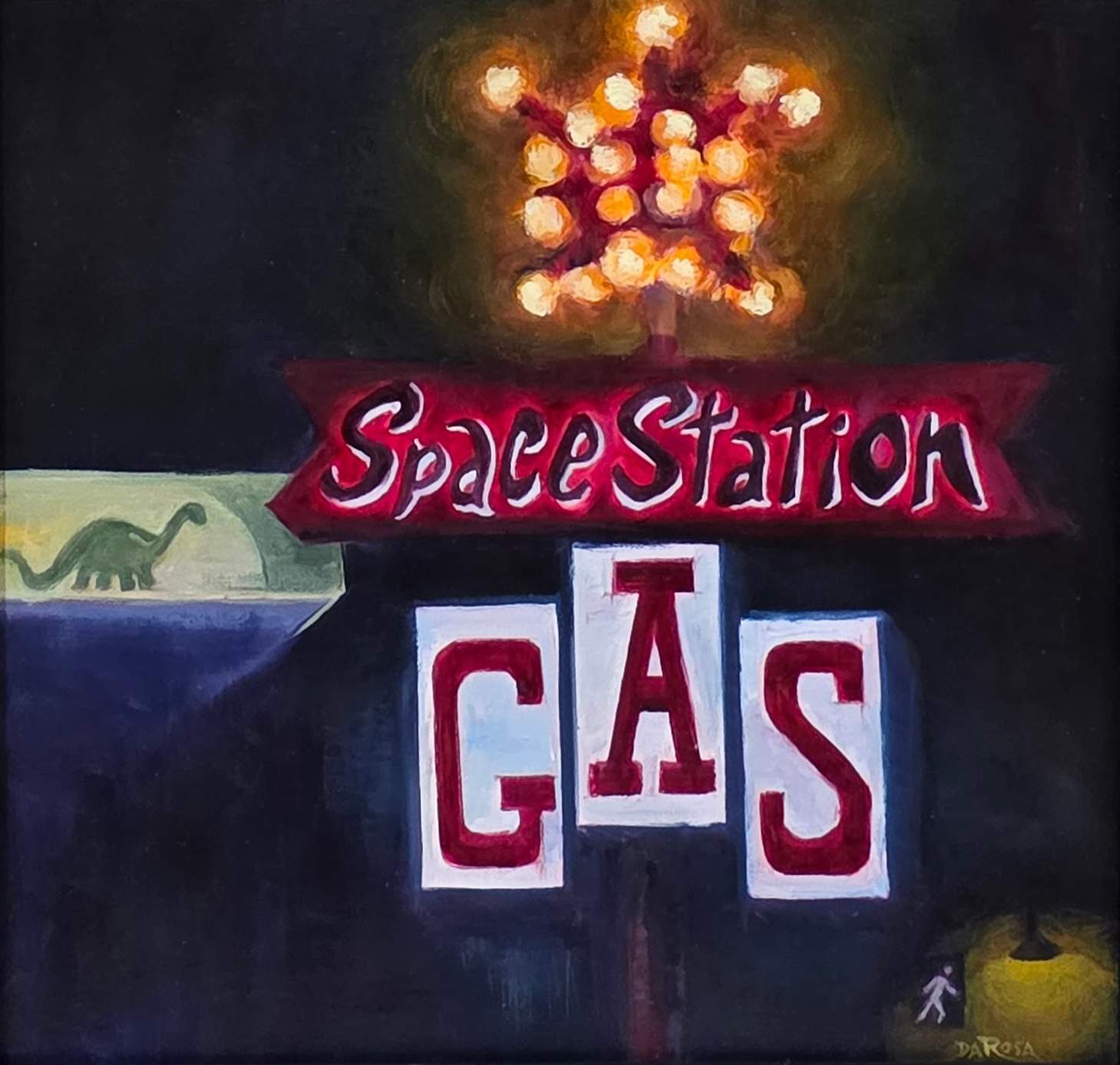 I do love signs. This is my second painting of the Space Station sign in Steamboat Springs. Painted on site (plein air) over two nights. The second under an umbrella in the rain. Always fun chatting with passersby. I find the design joke of the 80's dinosaur and the 1950s futurist Space Station hilarious.
